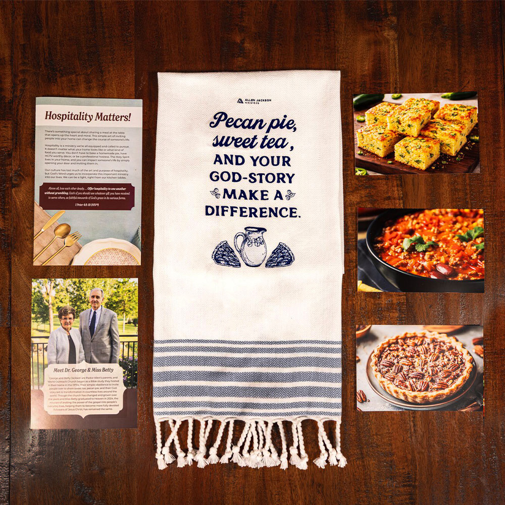 • A custom kitchen towel that reads, “Pecan pie, sweet tea, and your God-story make a difference.” With an absorbent cotton weave, this towel is durable and perfect for everyday use!